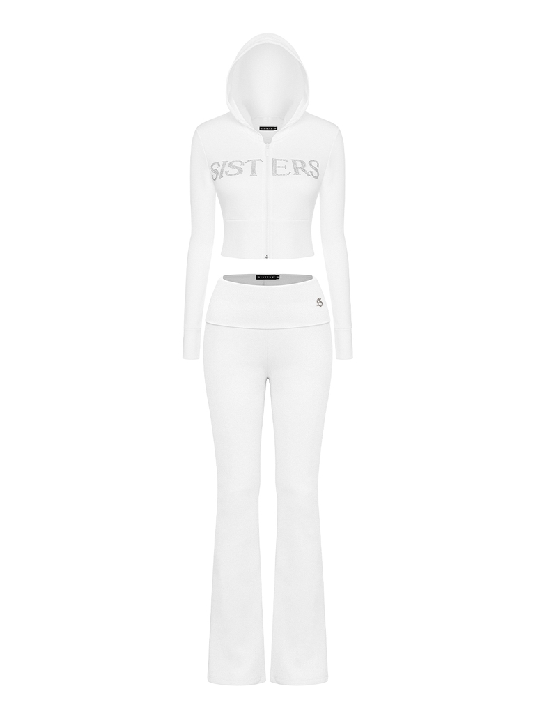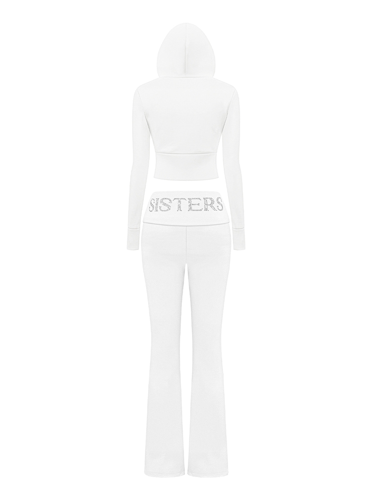 Set đồ bao gồm áo khoác croptop trắng có mũ và quần dài lưng lật ống loe, tạo nên một tổng thể hài hòa và kéo dài tỷ lệ chân một cách hiệu quả. Chiếc áo khoác croptop giúp khoe khéo vòng eo thon gọn, trong khi quần ống loe lưng lật mang lại hiệu ứng tôn vòng ba tuyệt đối.