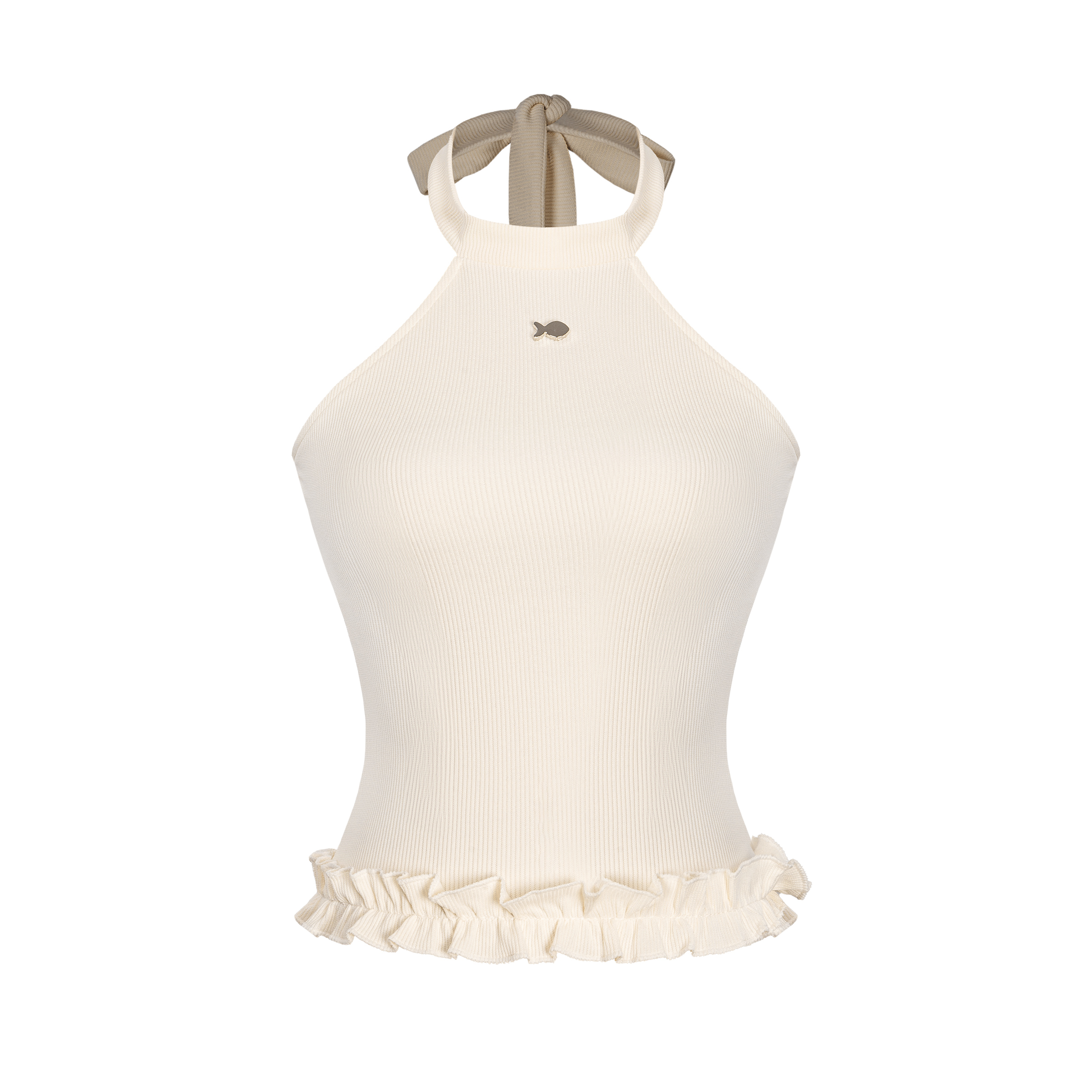 Set đồ bao gồm một chiếc áo yếm thắt dây nơ tinh tế tạo điểm nhấn nữ tính, trong khi họa tiết bèo nhún nhẹ nhàng mang lại cảm giác mềm mại và bồng bềnh. Chân váy ngắn ôm đi kèm tôn lên vóc dáng thon gọn, kết hợp hài hòa với áo, tạo nên tổng thể vừa trẻ trung, vừa thu hút.