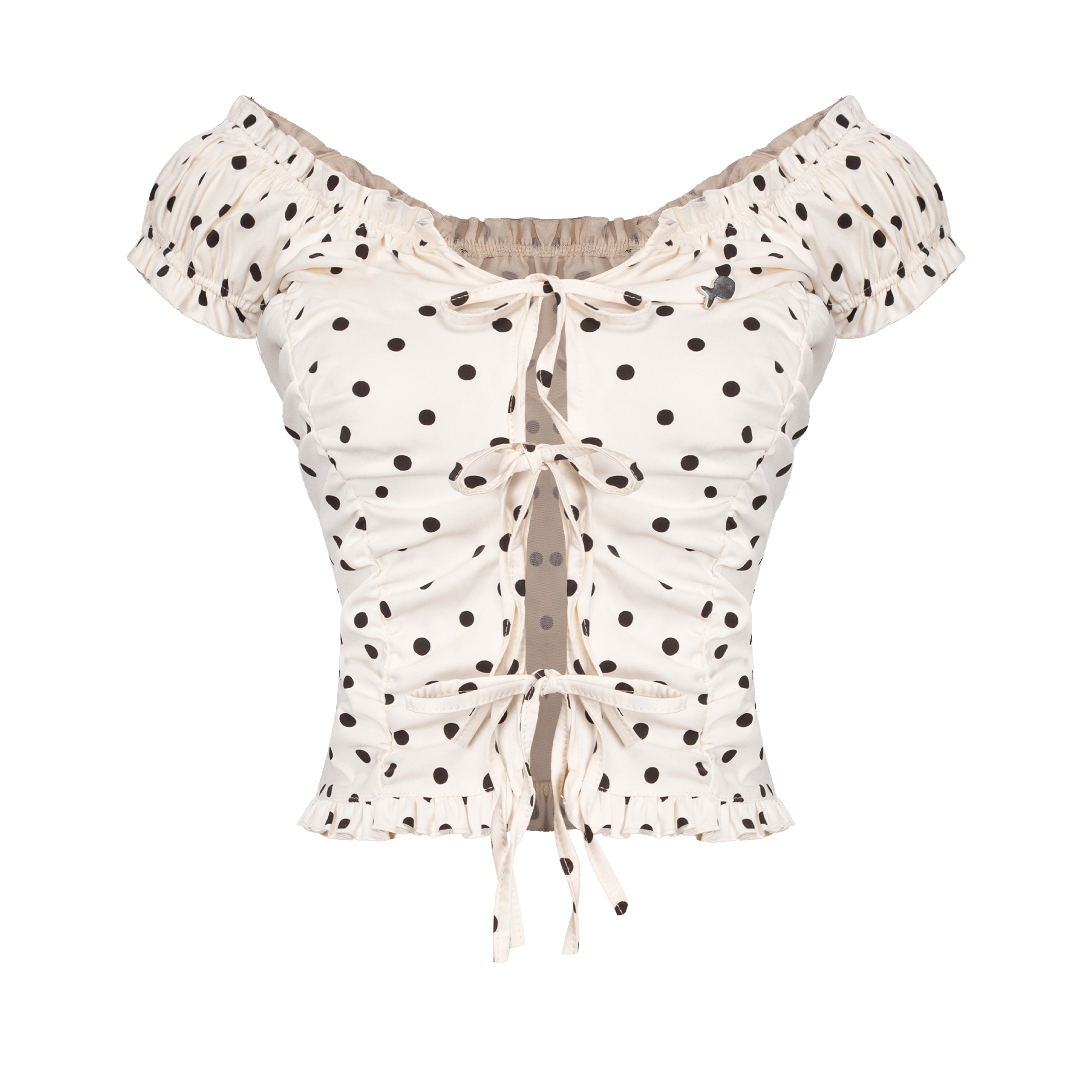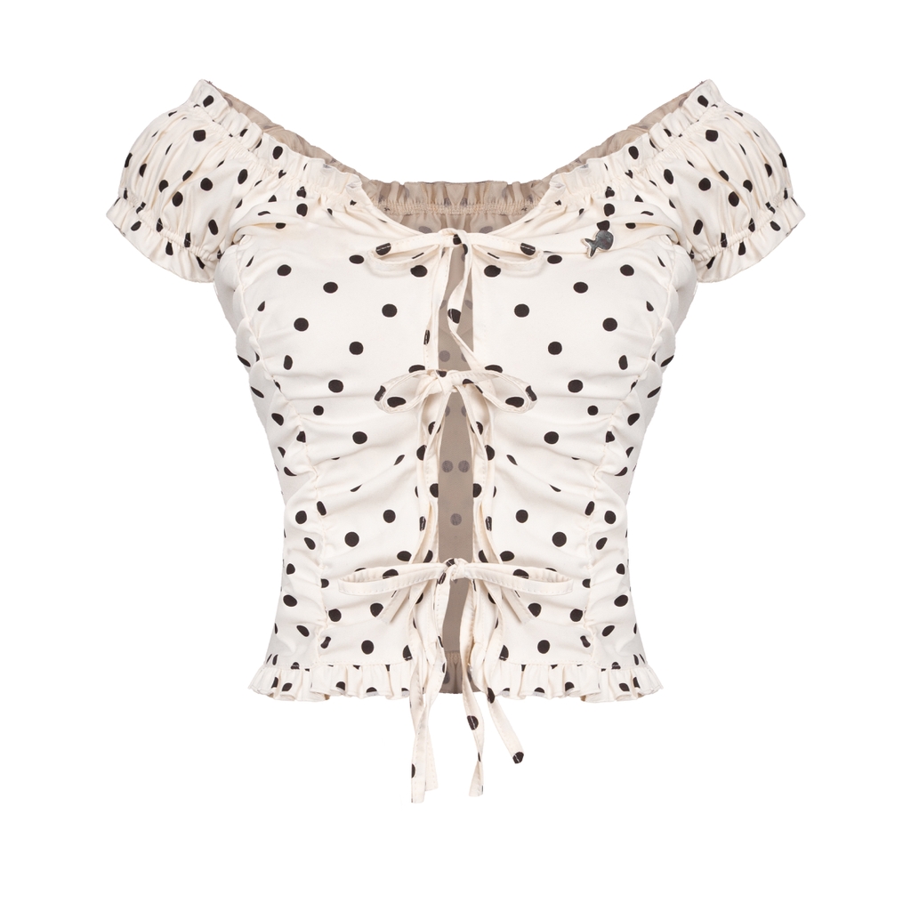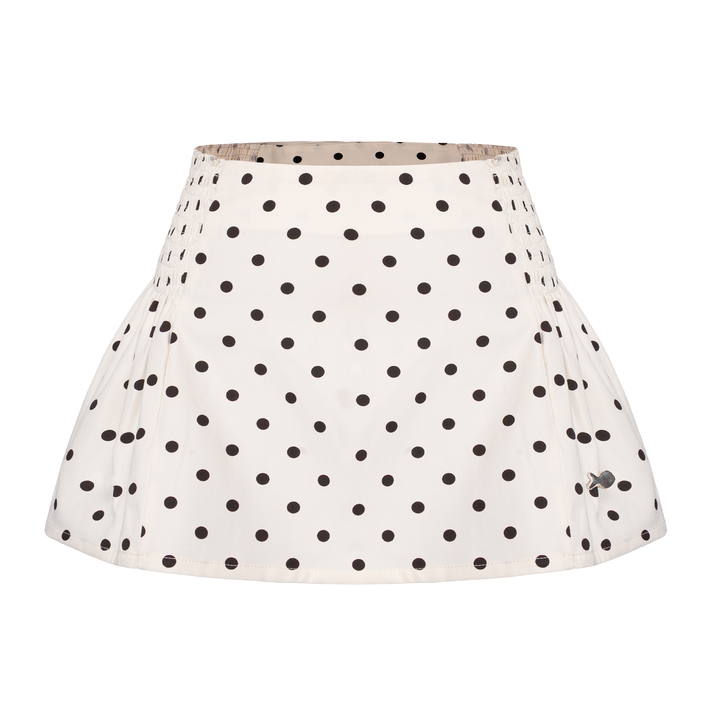 Họa tiết chấm bi trên nền vải màu kem là điểm nhấn nổi bật của Jiyoung Set, mang đến vẻ ngoài cổ điển nhưng không kém phần hiện đại và tinh nghịch. Sự kết hợp giữa những đường nhún bèo mềm mại và chi tiết dây thắt nơ duyên dáng càng làm tăng thêm vẻ đáng yêu, ngọt ngào cho bé.