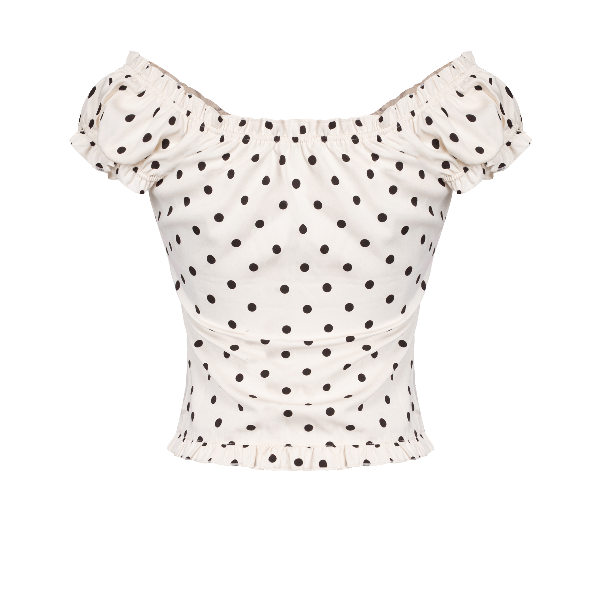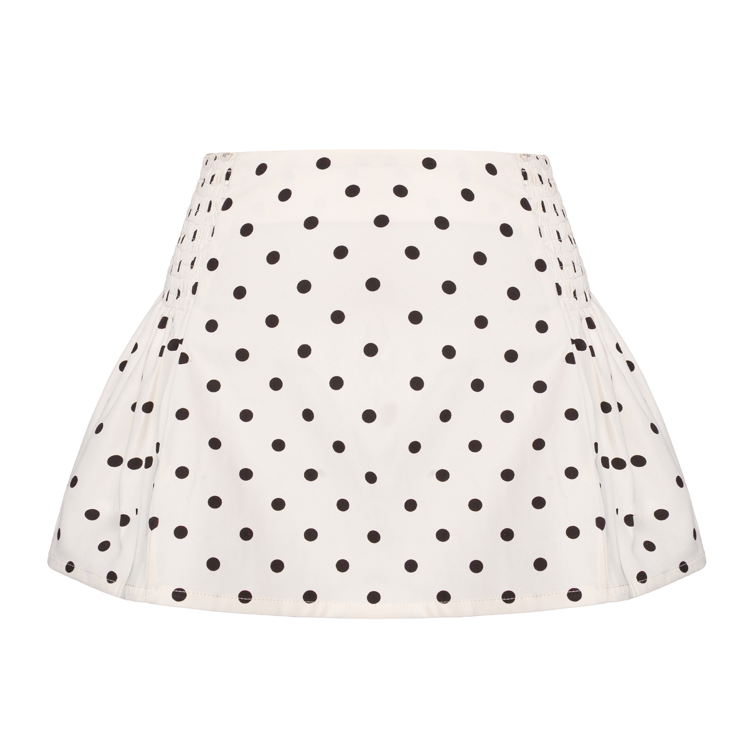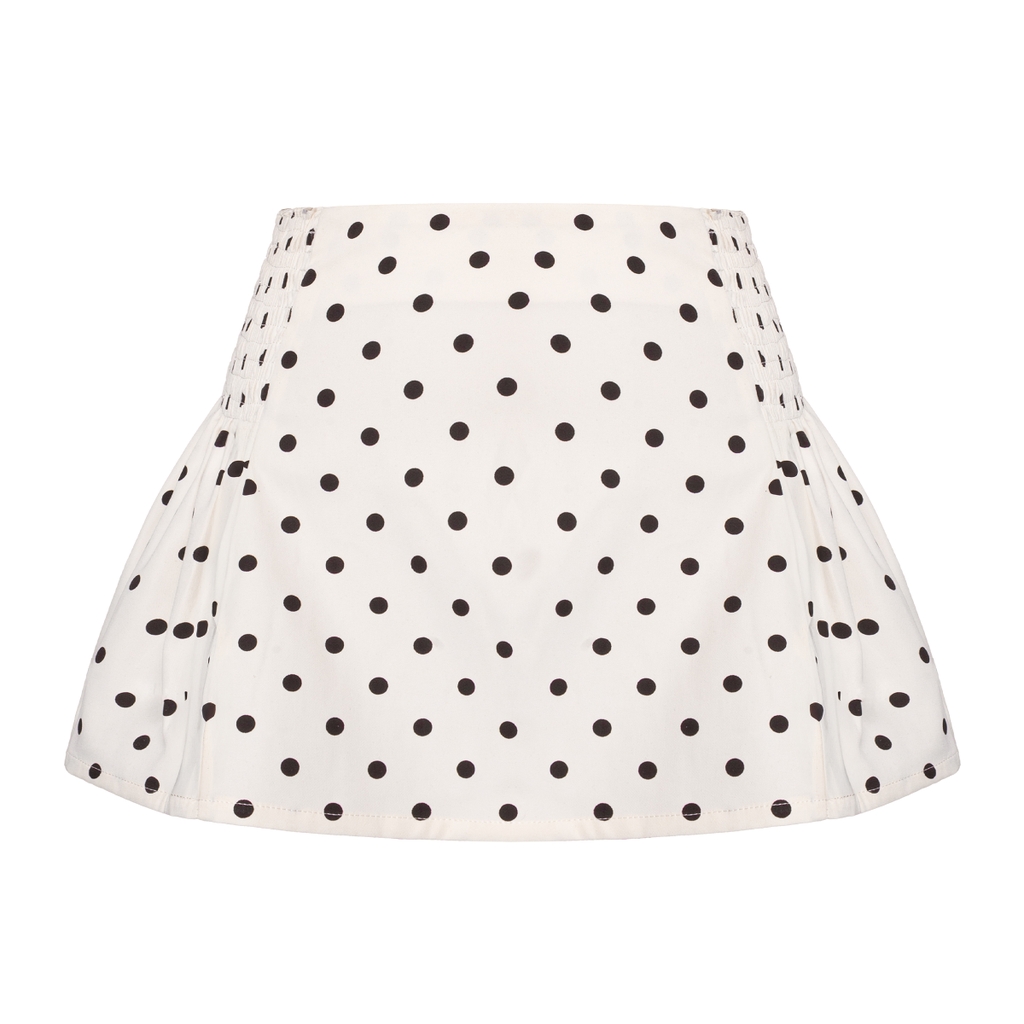 Họa tiết chấm bi trên nền vải màu kem là điểm nhấn nổi bật của Jiyoung Set, mang đến vẻ ngoài cổ điển nhưng không kém phần hiện đại và tinh nghịch. Sự kết hợp giữa những đường nhún bèo mềm mại và chi tiết dây thắt nơ duyên dáng càng làm tăng thêm vẻ đáng yêu, ngọt ngào cho bé.