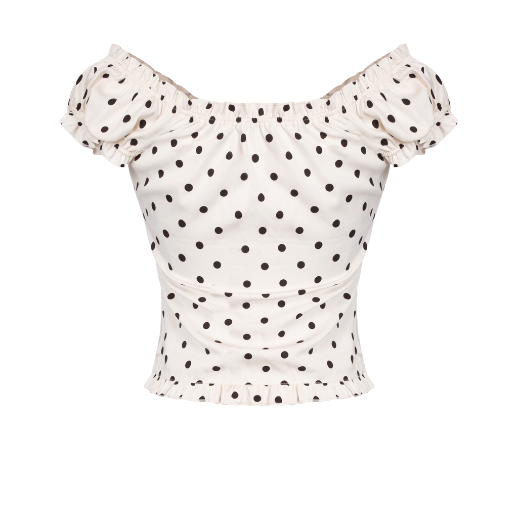 Jiyoung Set bao gồm Áo kiểu nữ dáng trễ vai và Chân váy chữ A dáng phồng với họa tiết chấm bi đáng yêu, tạo nên sự mềm mại và nữ tính. Phần nhún bèo duyên dáng cùng dây thắt nơ được phối khéo léo, mang đến điểm nhấn ngọt ngào và điệu đà cho bé.