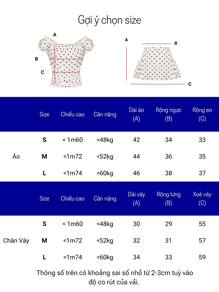 | Chân váy | Size | Rộng lưng | Xoè váy | Dài váy |