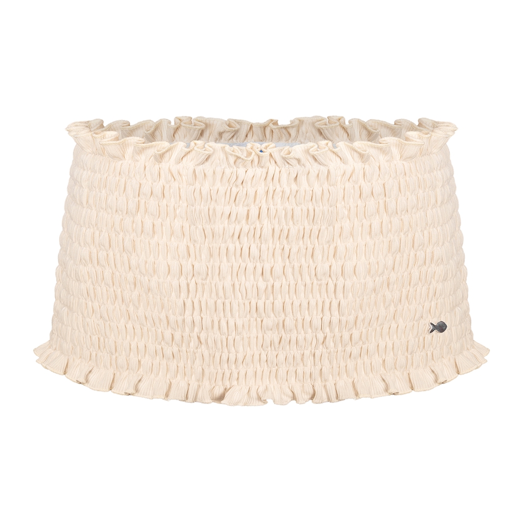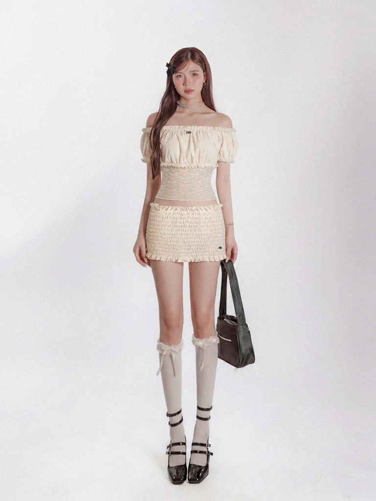 Không kém phần nổi bật, chân váy ngắn cũng góp phần tạo nên sự đáng yêu cho set đồ. Chi tiết thân nhún dọc theo váy mang lại sự thướt tha và kiêu kỳ cho mỗi bước đi.