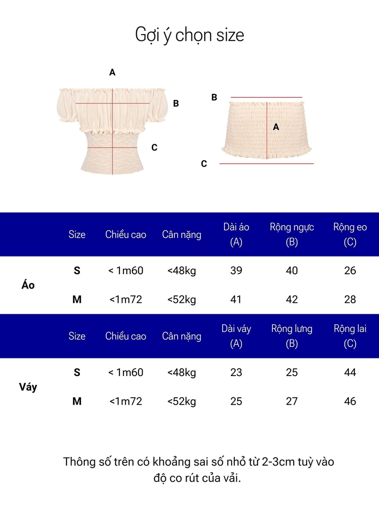 | Chân váy | Size | Dài váy | Rộng lưng | Rộng lai |
