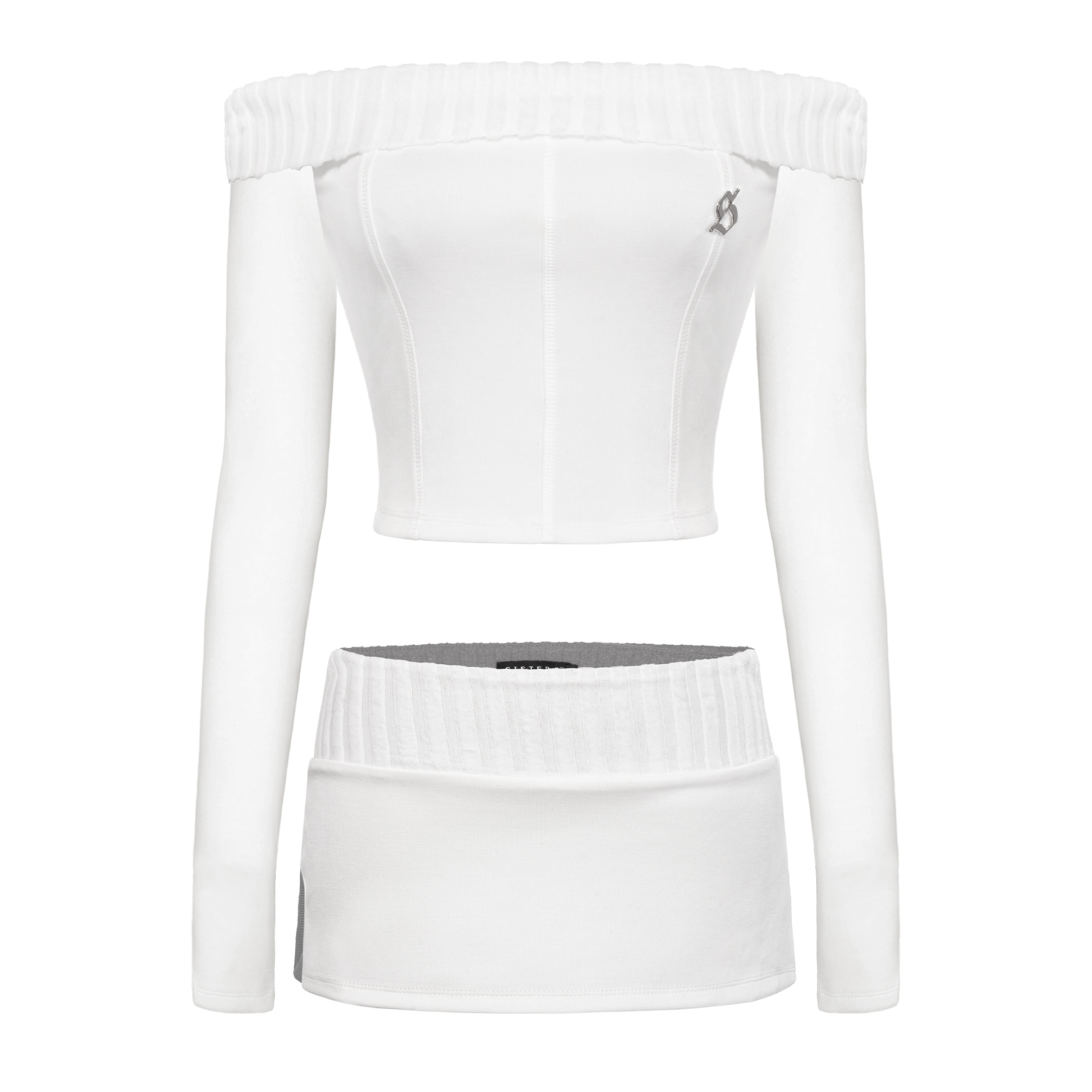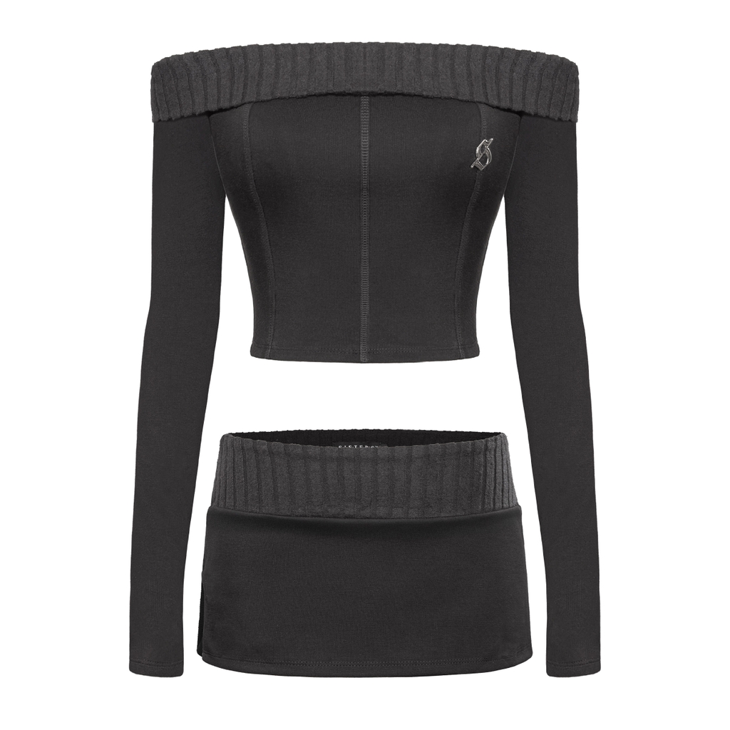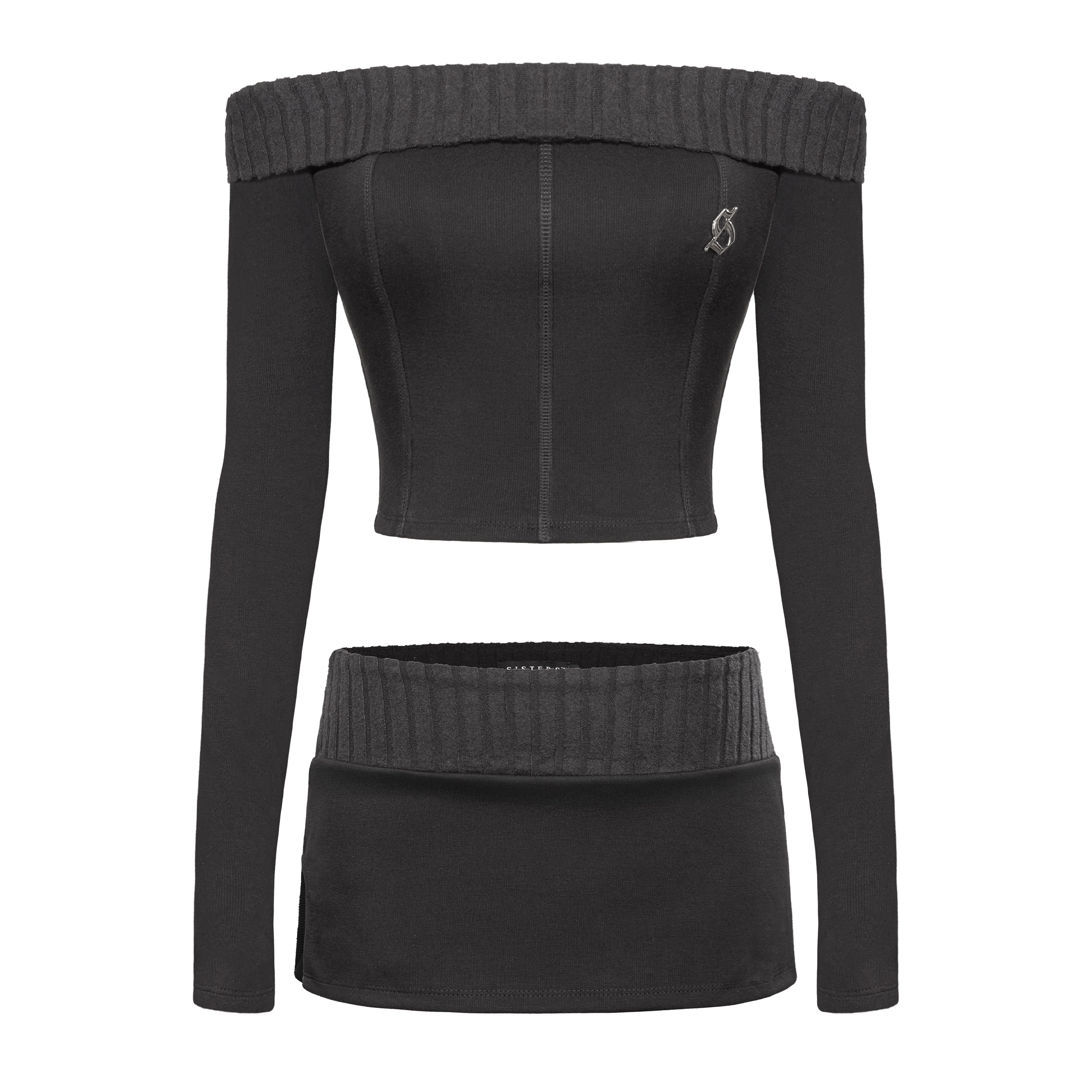 Set đồ nữ có thiết kế áo trễ vai tay dài kết hợp cùng chân váy ngắn xẻ tà tôn lên vẻ đẹp nữ quyền đầy mê hoặc, khơi gợi nét quyến rũ từ bờ vai đến từng bước chân.