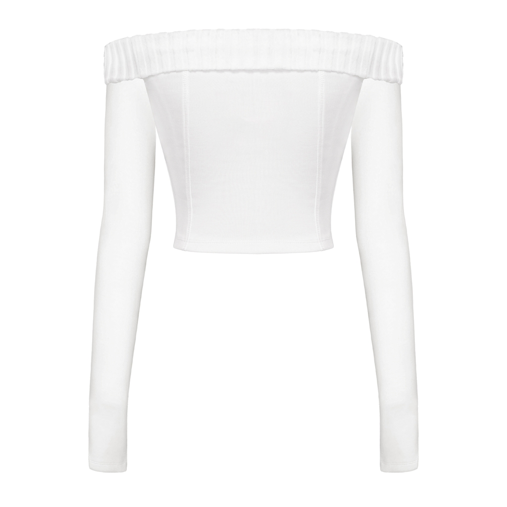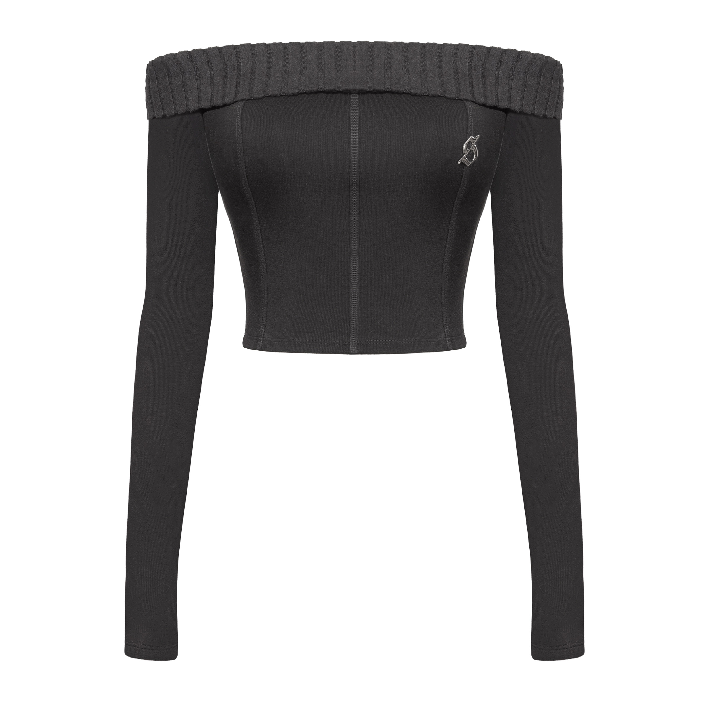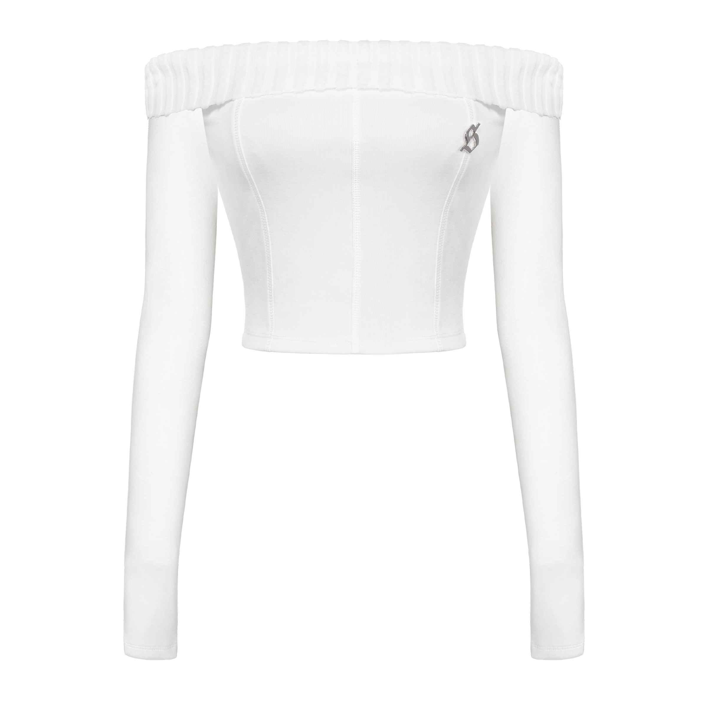 Set đồ nữ có thiết kế áo trễ vai tay dài kết hợp cùng chân váy ngắn xẻ tà tôn lên vẻ đẹp nữ quyền đầy mê hoặc, khơi gợi nét quyến rũ từ bờ vai đến từng bước chân.