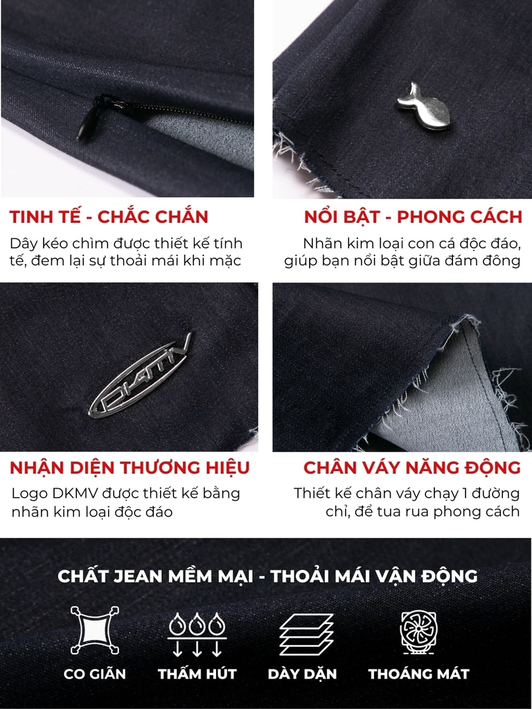 Với chất liệu jean mềm mại, co giãn nhẹ giúp nàng thoải mái trong mọi hoạt động hàng ngày. Thiết kế tag kim loại hình cá signature nhà DKMV sáng bóng, bền bỉ và độc quyền từ thương hiệu ở viền áo, chính sẽ là một điểm nhấn nổi bật cho các nàng khi mặc lên người.