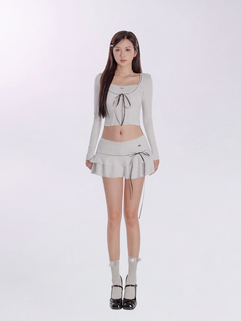 Chiếc áo croptop tay dài cổ vuông được thiết kế để làm bật lên vẻ e ấp và duyên dáng của bé. Những dải ruy băng thắt nơ nhỏ xíu kết hợp cùng đường phối ren tỉ mỉ tạo nên một phong cách điệu đà khó cưỡng. Chất vải mềm mại ôm nhẹ lấy cơ thể, mang lại cảm giác thoải mái và xinh yêu.
