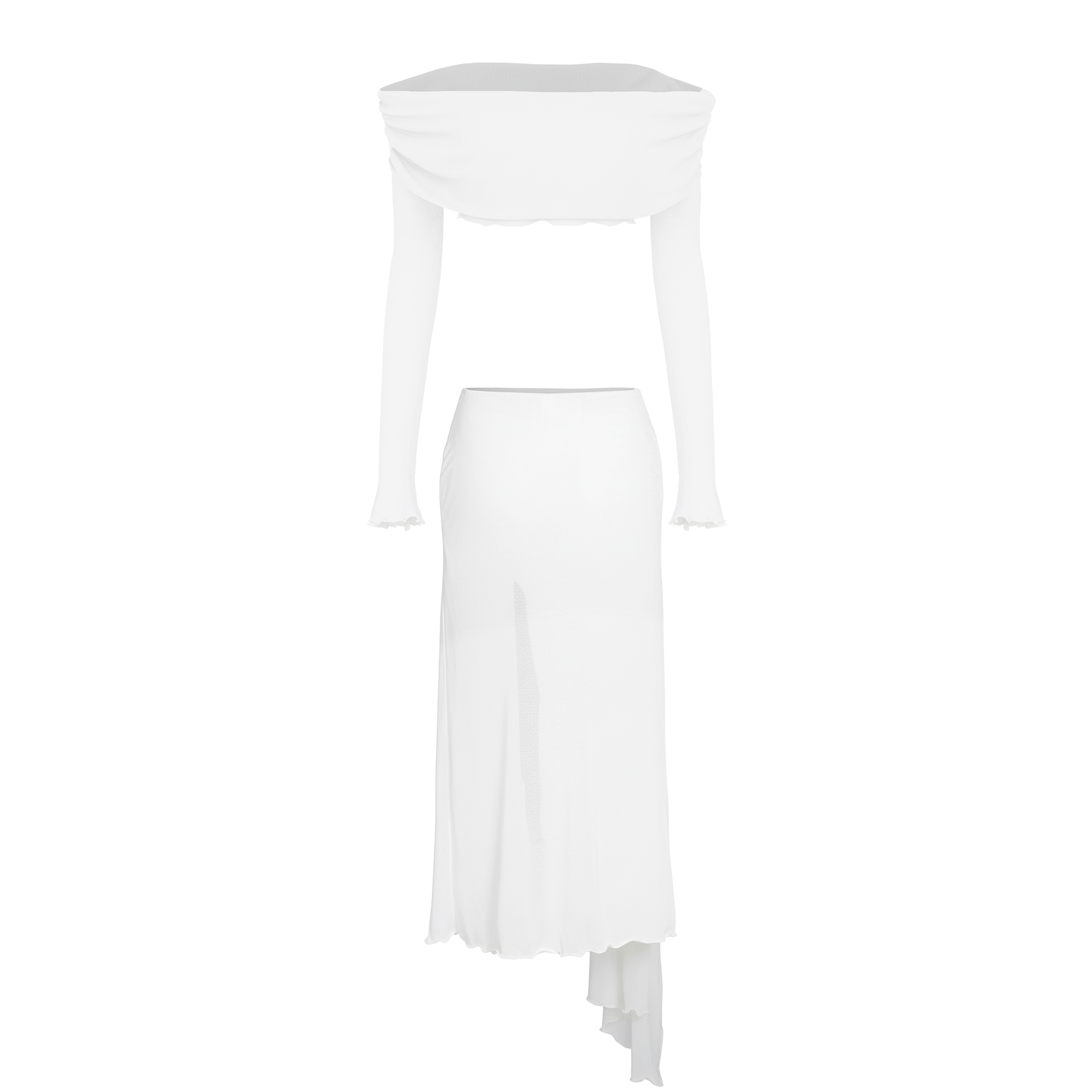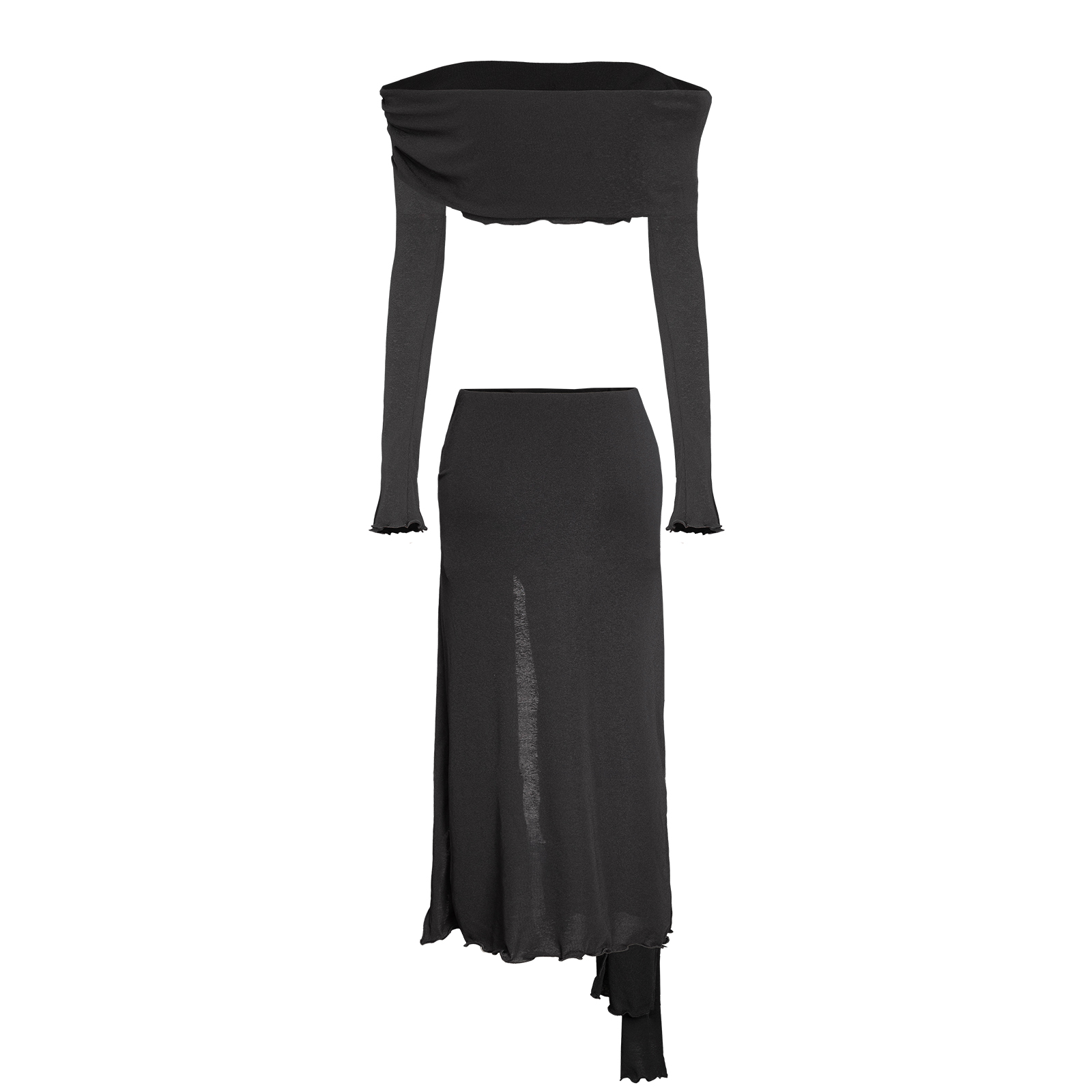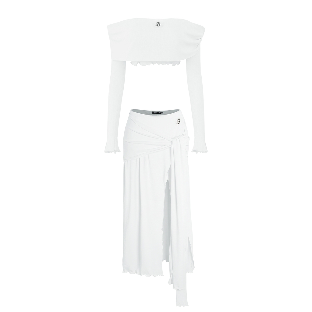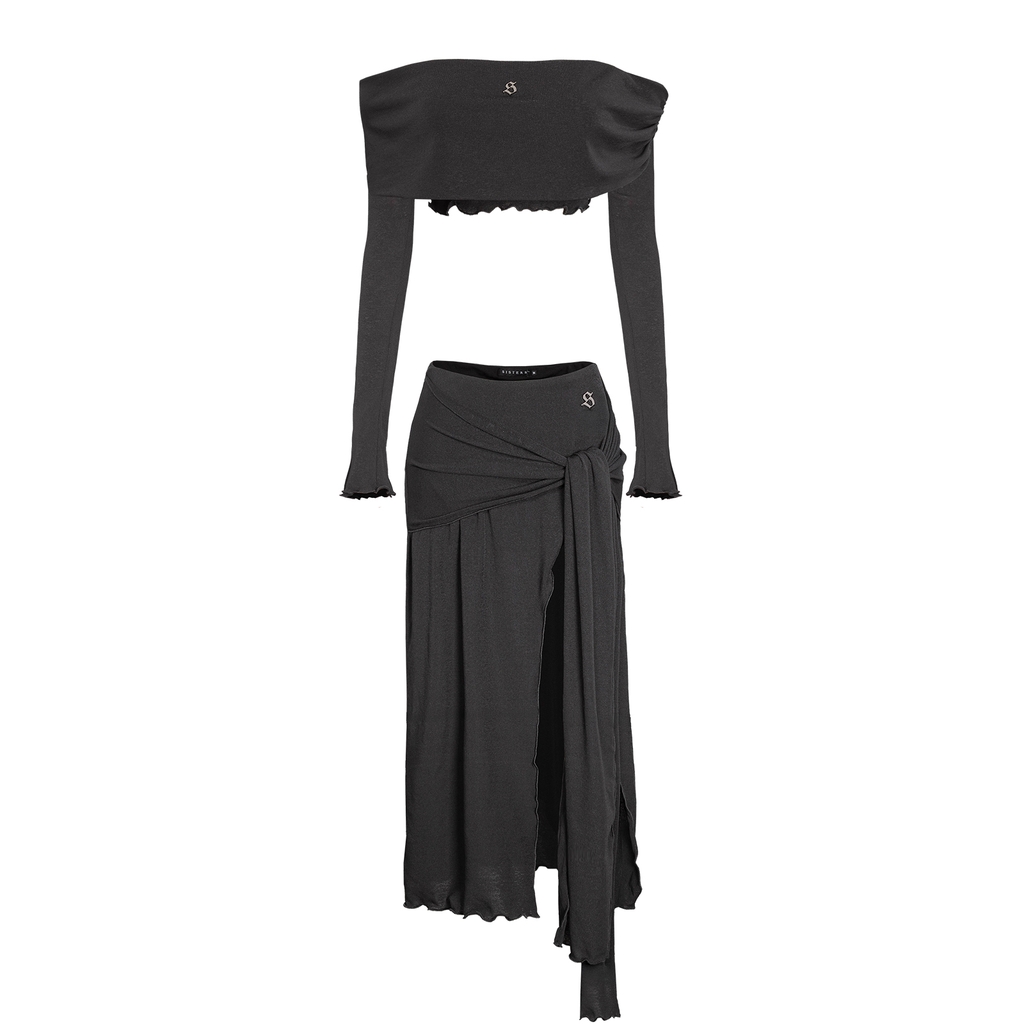 Thiết kế váy trễ vai dài kết hợp áo croptop tay dài ôm body, tôn trọn đường cong và khoe khéo bờ vai trần đầy quyến rũ. Phần váy xẻ tà nhẹ nhàng tạo khoảng hở tinh tế, giúp từng bước di chuyển thêm phần mềm mại và gợi cảm.