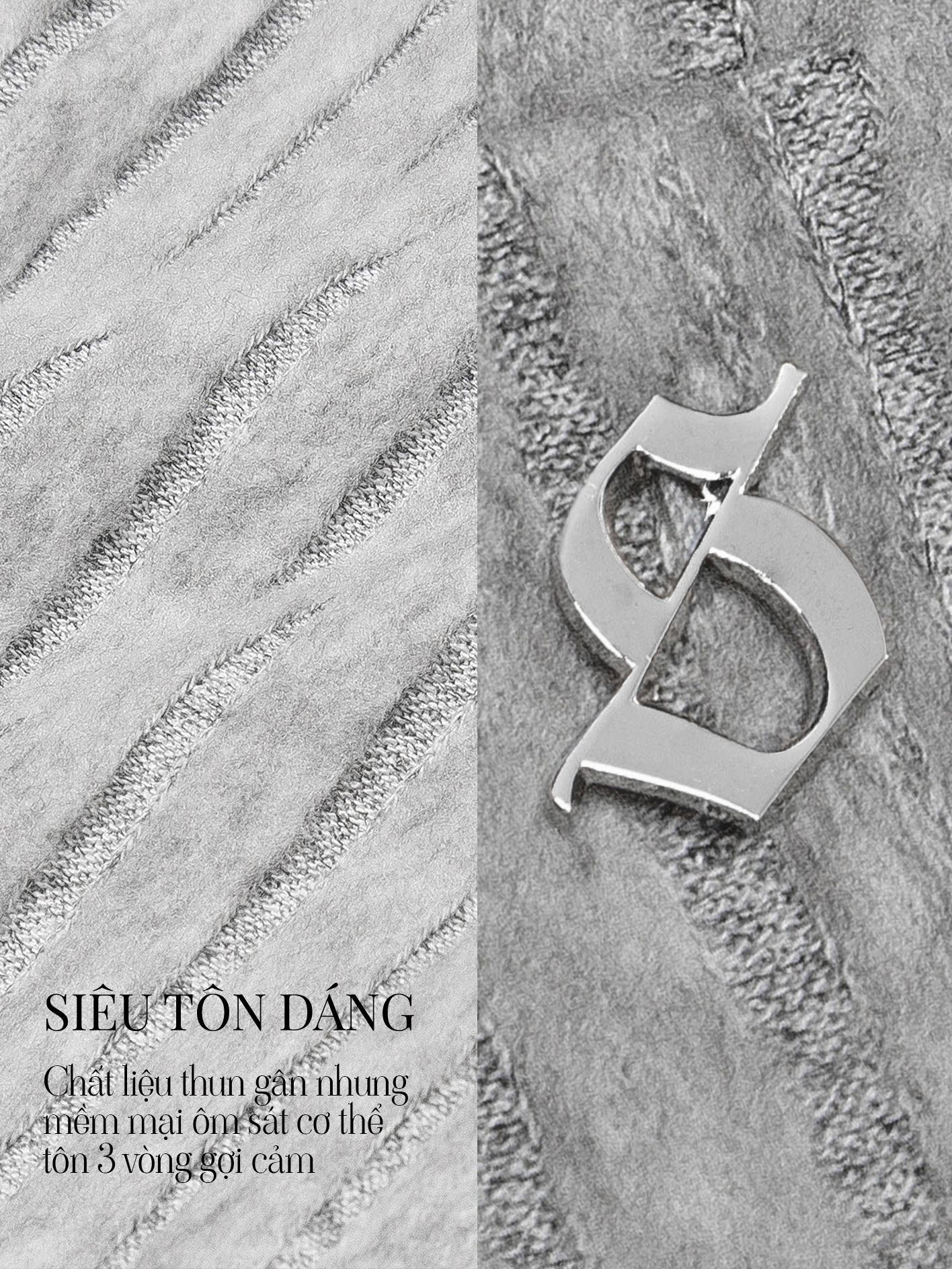 Chất liệu gân nhung mềm mại, ôm sát cơ thể, tôn lên đường cong chữ S hoàn mỹ.