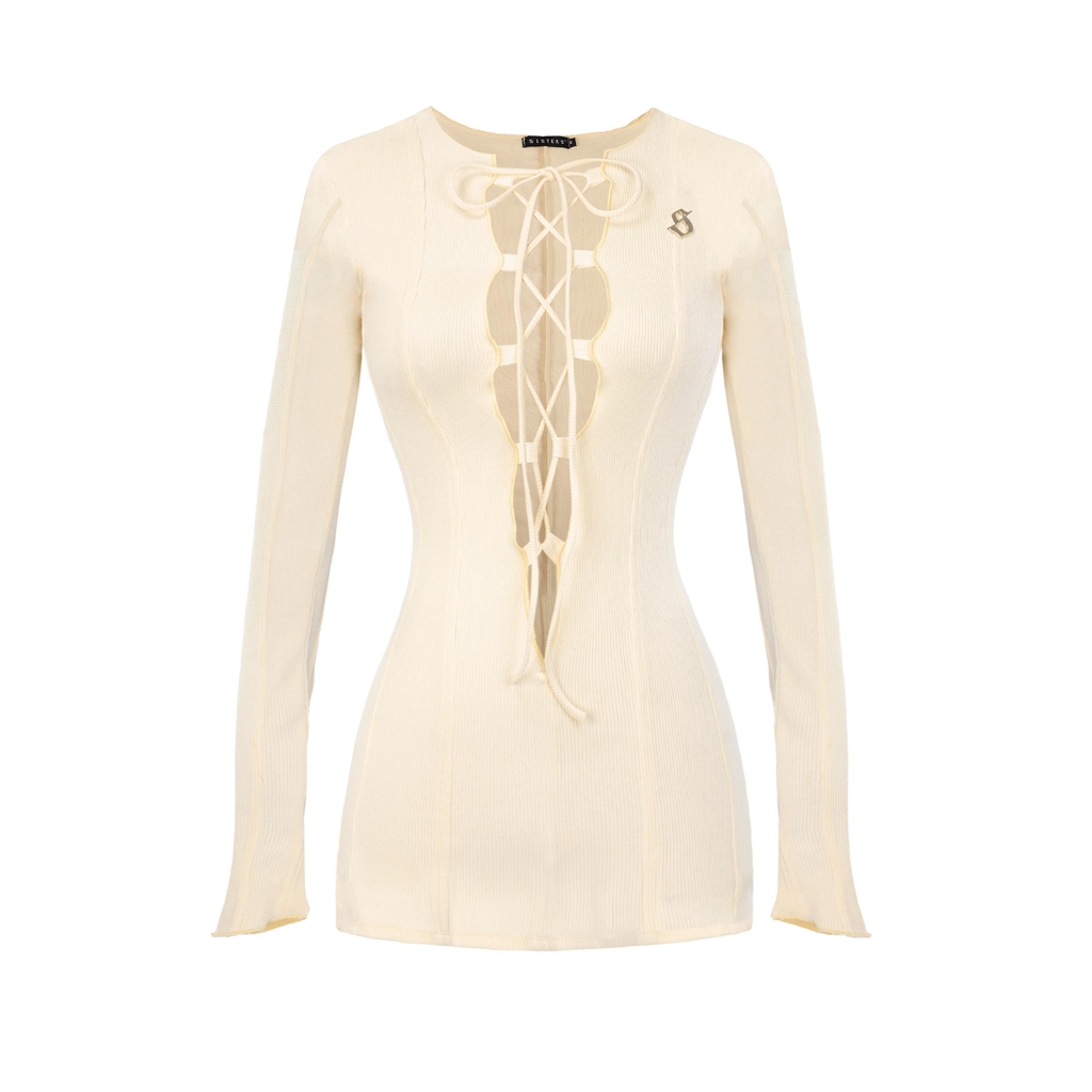 Đầm body sở hữu những đường đan dây ngực được thiết kế tỉ mỉ kết hợp cùng tay áo nhún bèo duyên dáng, tôn lên những đường cong quyến rũ của phái đẹp.