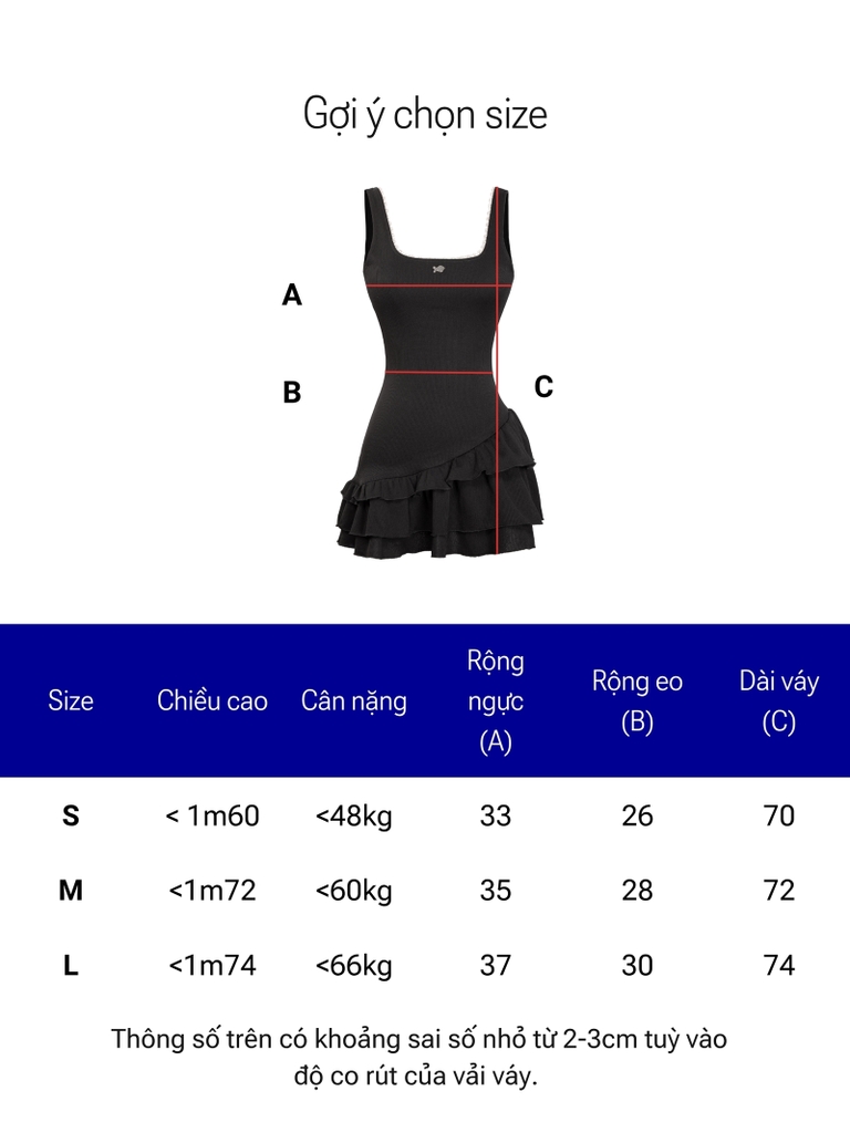 | Size | Rộng ngực | Rộng eo | Dài váy |