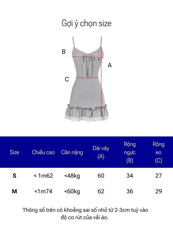 | Size | Rộng ngực | Rộng eo | Dài váy |