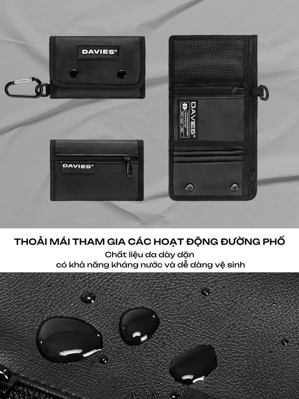 Davies sử dụng chất liệu da PU cao cấp, với độ dày vừa phải, tạo form dáng ví cứng cáp, đẹp mắt. Chất liệu da này có khả năng chống nước và bụi bẩn, dễ dàng vệ sinh, giúp ví luôn bền đẹp và tiện lợi trong sử dụng.