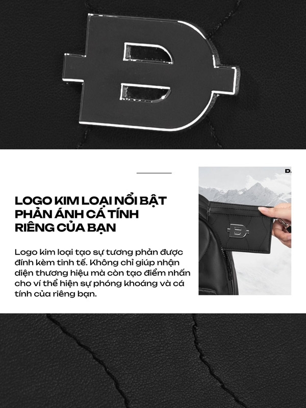 Logo kim loại tạo sự tương phản được đính kèm tinh tế ở mặt trước ví. Không chỉ giúp nhận diện thương hiệu mà còn tạo điểm nhấn cho ví thể hiện sự phóng khoáng và tính cá nhân độc đáo của người sử dụng.